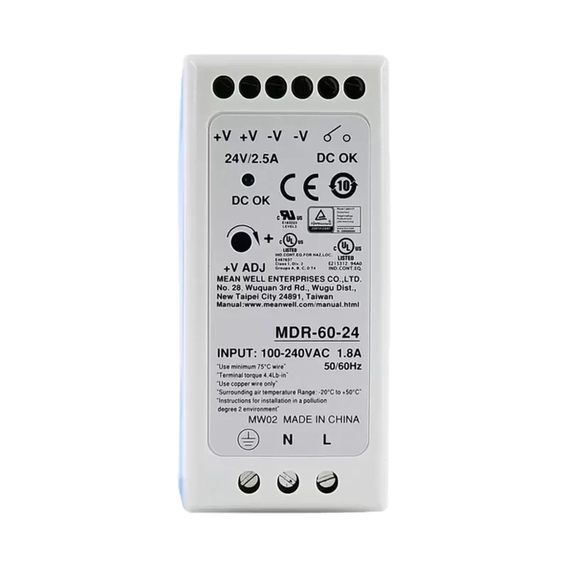The MEAN WELL MDR-60-24 is a 60W Single Output Industrial DIN Rail Power Supply engineered for high-density installation in factory automation environments. This unit utilizes Original Engineering standards to deliver a regulated 24V DC output with a focus on minimizing no-load power consumption, making it suitable for energy-efficient control systems. The ultra-slim form factor allows for optimized utilization of rail space within crowded control cabinets, ensuring Technical Compatibility with standard TS-35/7.5 or TS-35/15 mounting rails. The device features a plastic housing designed to facilitate effective heat dissipation through free air convection, ensuring reliability without internal fans.