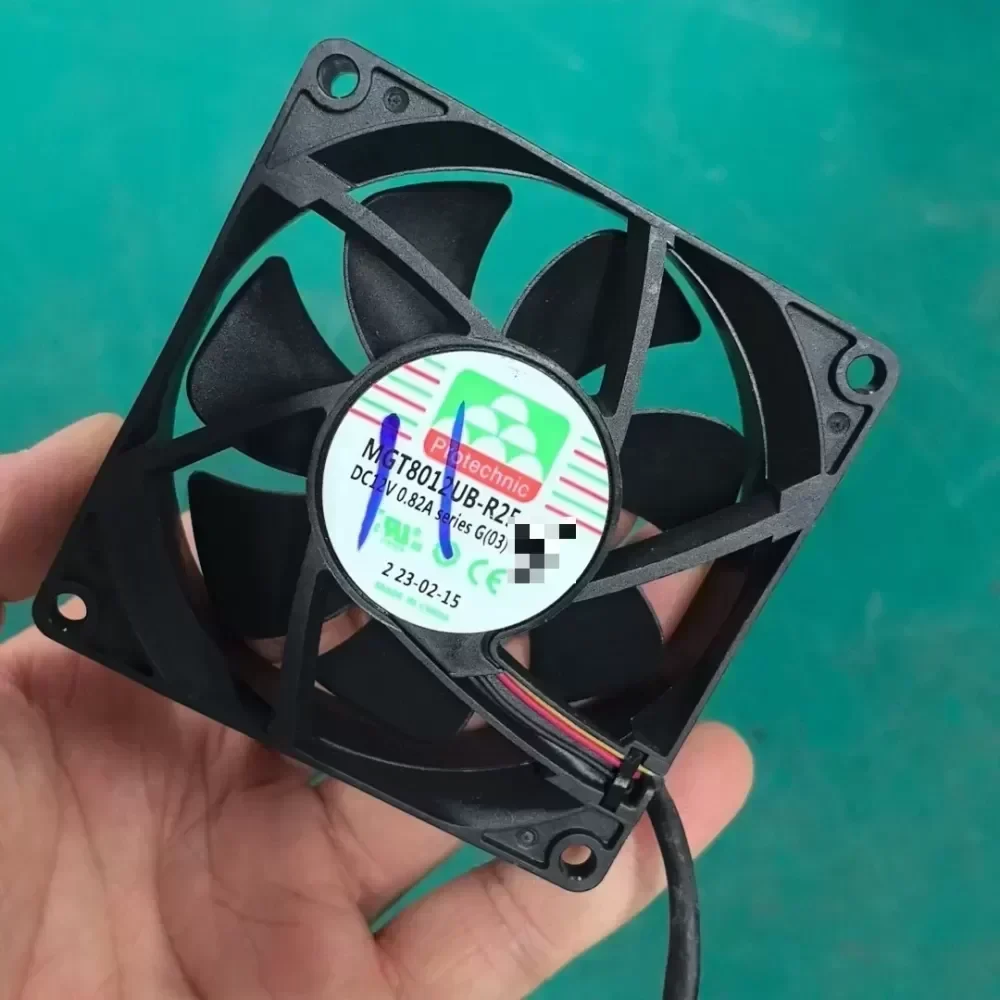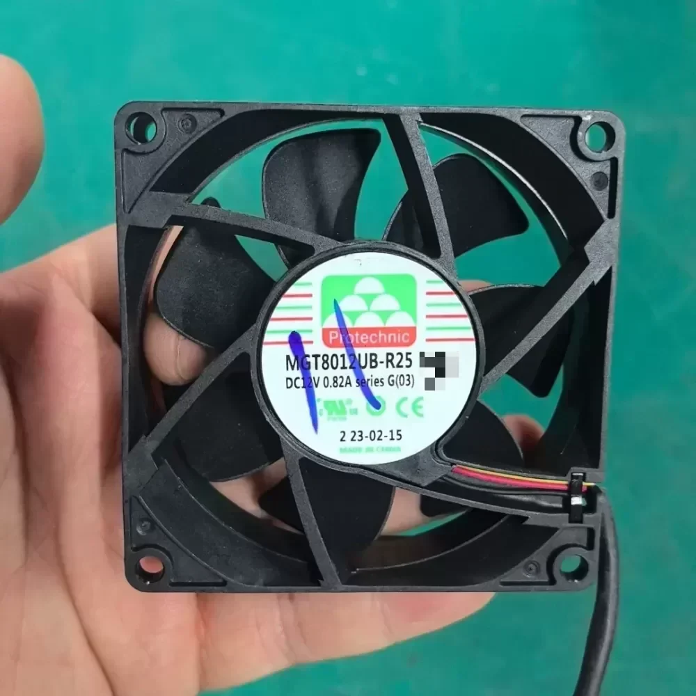 The Protechnic MGT8012UB-R25 is a high-performance 80mm axial cooling fan engineered for demanding thermal management in industrial and server environments. This unit features a dual ball bearing system designed for continuous 24/7 operation and high reliability under elevated ambient temperatures. With a rated current of 0.82A at 12V DC, it delivers exceptional static pressure and airflow, making it suitable for high-density chassis and heat sink applications where Original Engineering standards are required.