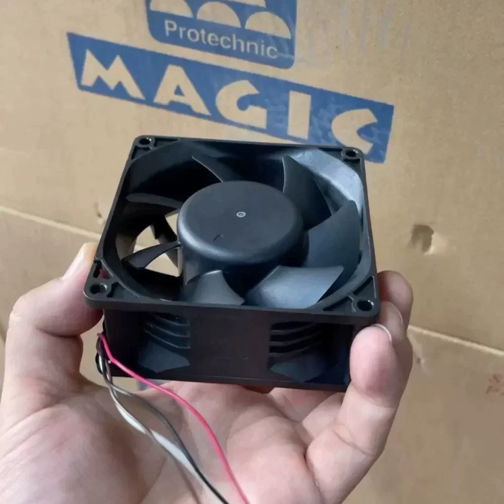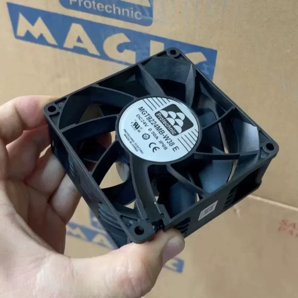 The Protechnic MGT9224MB-W38E is a high-performance industrial axial fan engineered for demanding thermal management applications. This 92 x 92 x 38 mm unit operates on a 24 VDC nominal voltage with a rated current of 0.50 A, delivering a balance of high static pressure and efficient airflow. Featuring an IP68 ingress protection rating, the fan is fully protected against dust and capable of continuous immersion in water, making it ideal for outdoor equipment and wash-down environments.