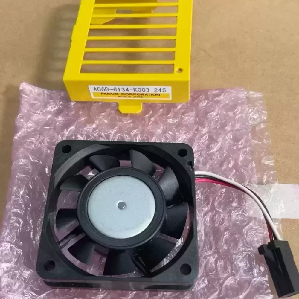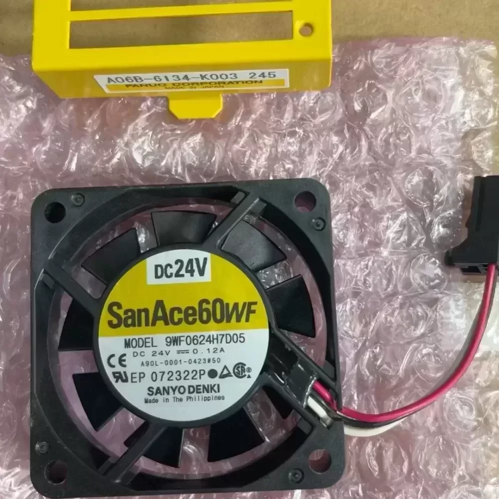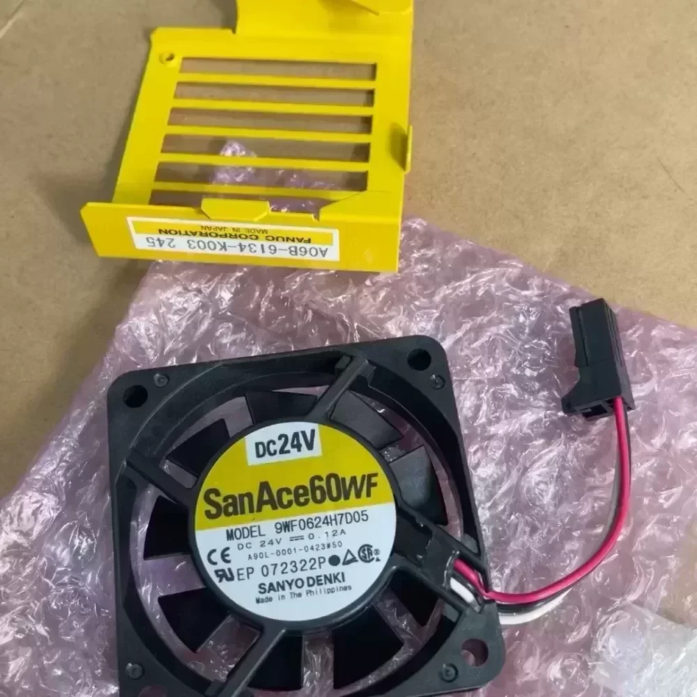 The new original Sanyo SanAce 60WF inverter cooling fan, model 9WF0624H7D05, voltage 24V, current 0.12A. Equipped with yellow cooling bracket, suitable for Fanuc drivers.