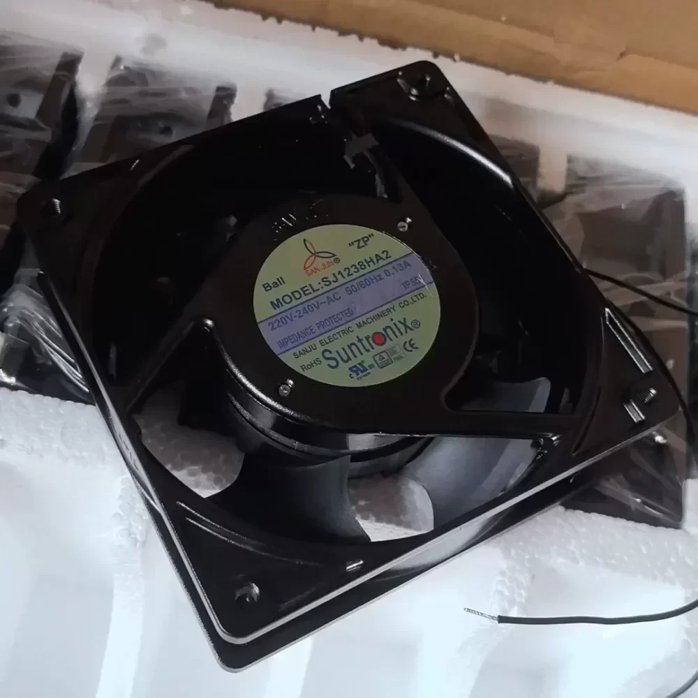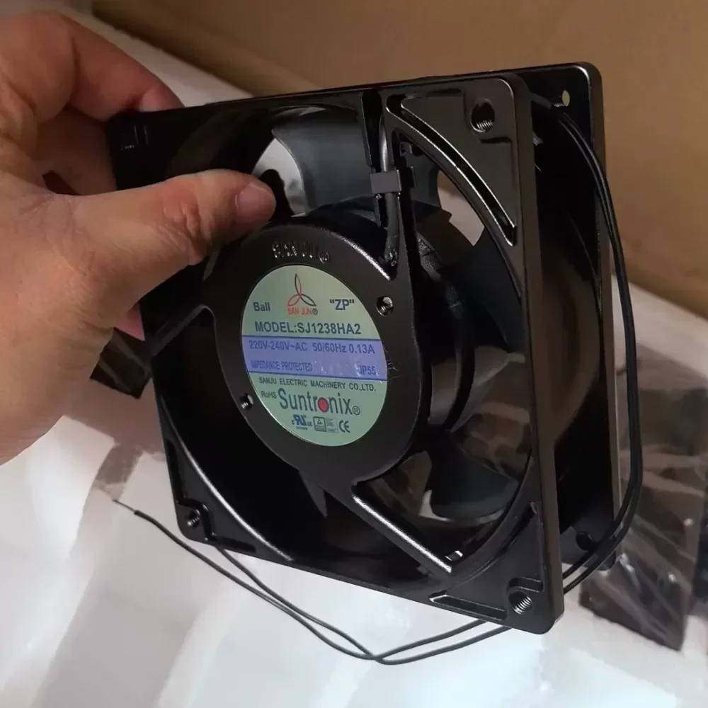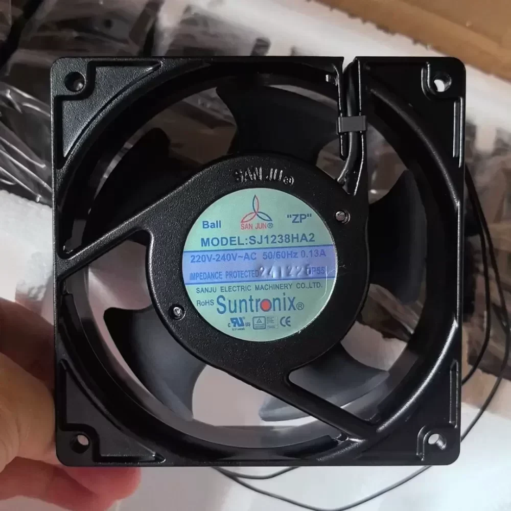 The Taiwan Sanju SJ1238HA2 is a professional-grade AC axial cooling fan engineered for high-reliability thermal management in industrial environments. This 120 x 120 x 38 mm unit is constructed with a robust frame and high-efficiency impellers to ensure consistent airflow under pressure. Utilizing a dual ball bearing system, the SJ1238HA2 offers an extended service life and superior performance in various mounting orientations compared to sleeve bearing alternatives.