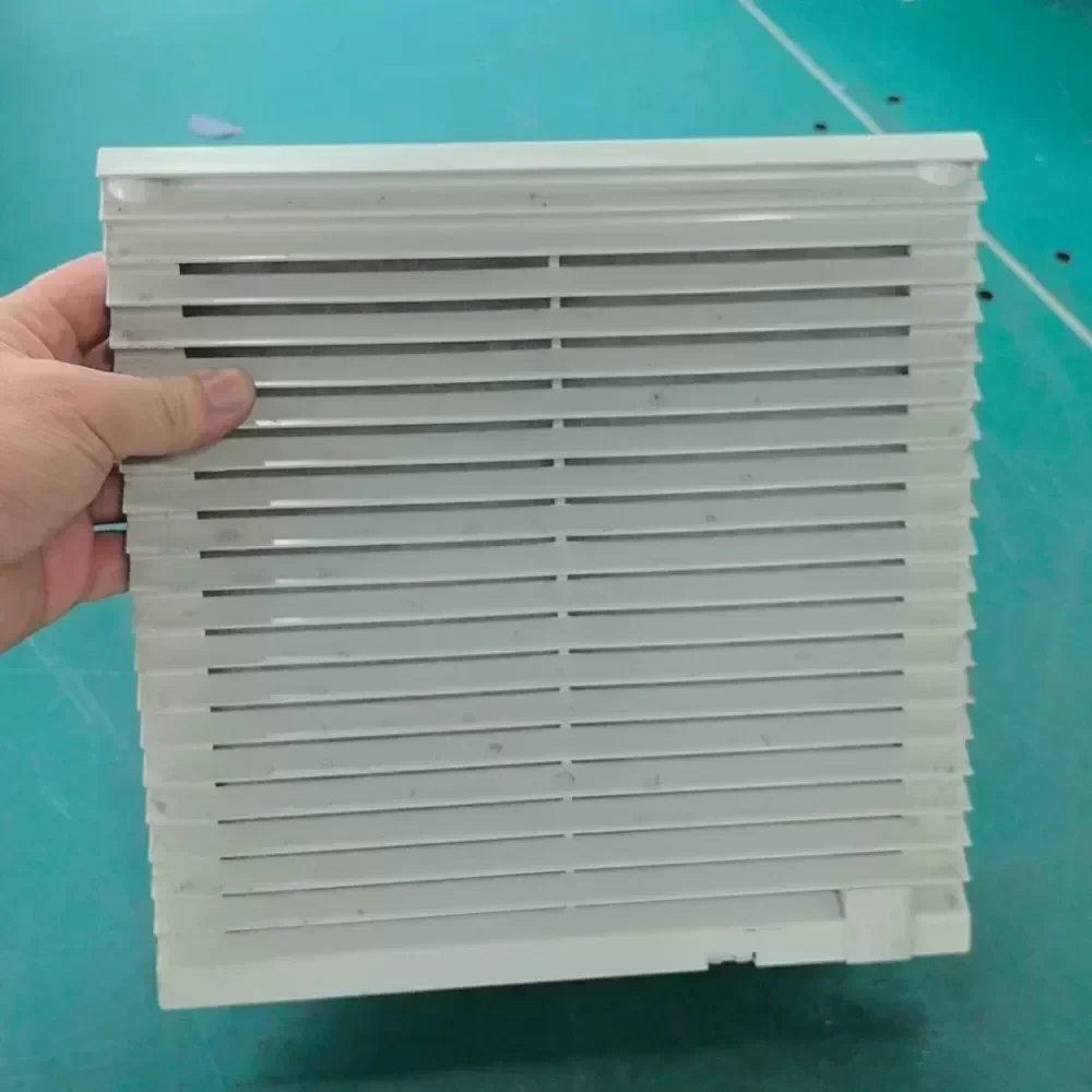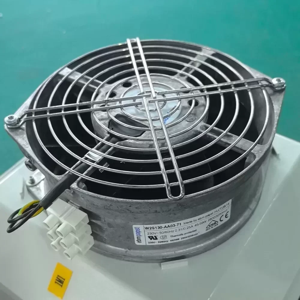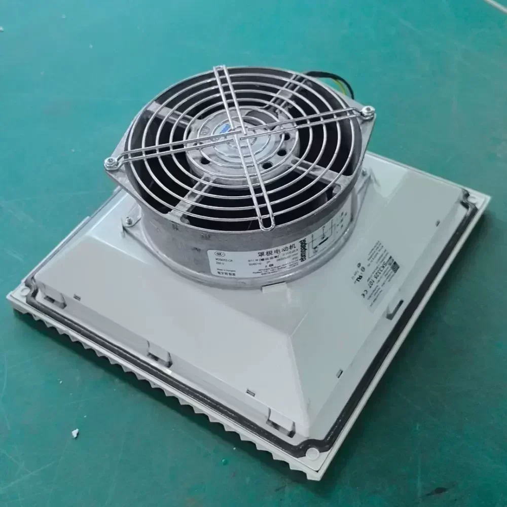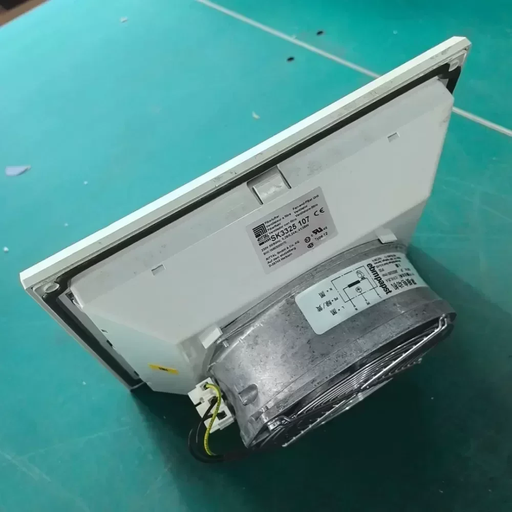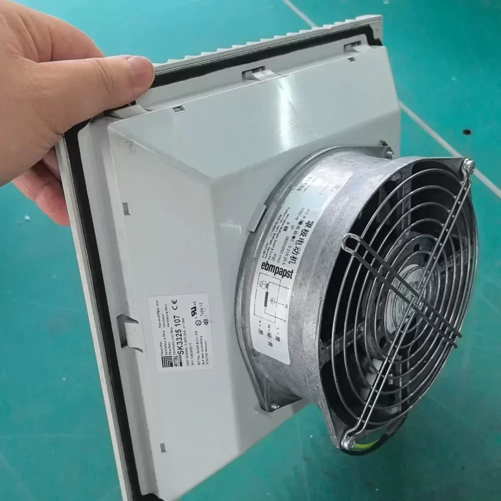 The Rittal SK3325.107, powered by the ebm-papst W2S130-AA03-71 axial fan, is a high-performance thermal management solution designed for industrial enclosures and server racks. Engineered for continuous duty, this unit provides efficient heat dissipation to protect sensitive electronic components from thermal stress. The fan operates on a 230 VAC supply, delivering a power output of 45W at 50Hz and 39W at 60Hz, ensuring reliable airflow across various global power standards. This specific unit is a professional disassembly from new equipment, maintaining original engineering integrity and performance. It comes equipped with a protective mesh cover to ensure safety and ease of installation in Rittal cabinet chassis or custom ventilation systems.
